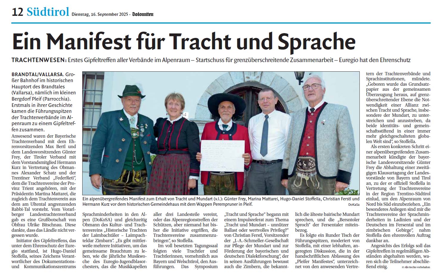 Ein Manifest für Tracht und Sprache [Symposium "Tracht und Sprache" im Rahmen des 1. Gipfeltreffens der Trachtenverbände im Alpenraum in Pleif im Brandtal]