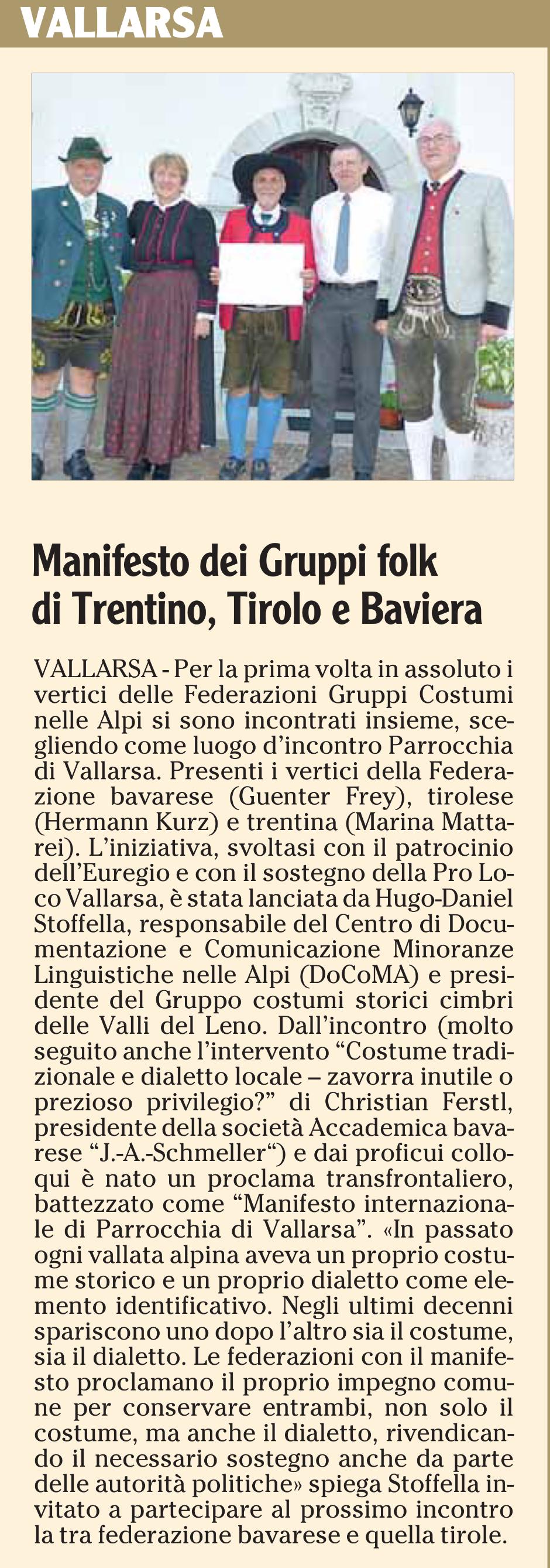 Pleifer Manifest unterzeichnet [Symposium "Tracht und Sprache" im Rahmen des 1. Gipfeltreffens der Trachtenverbände im Alpenraum in Pleif im Brandtal]